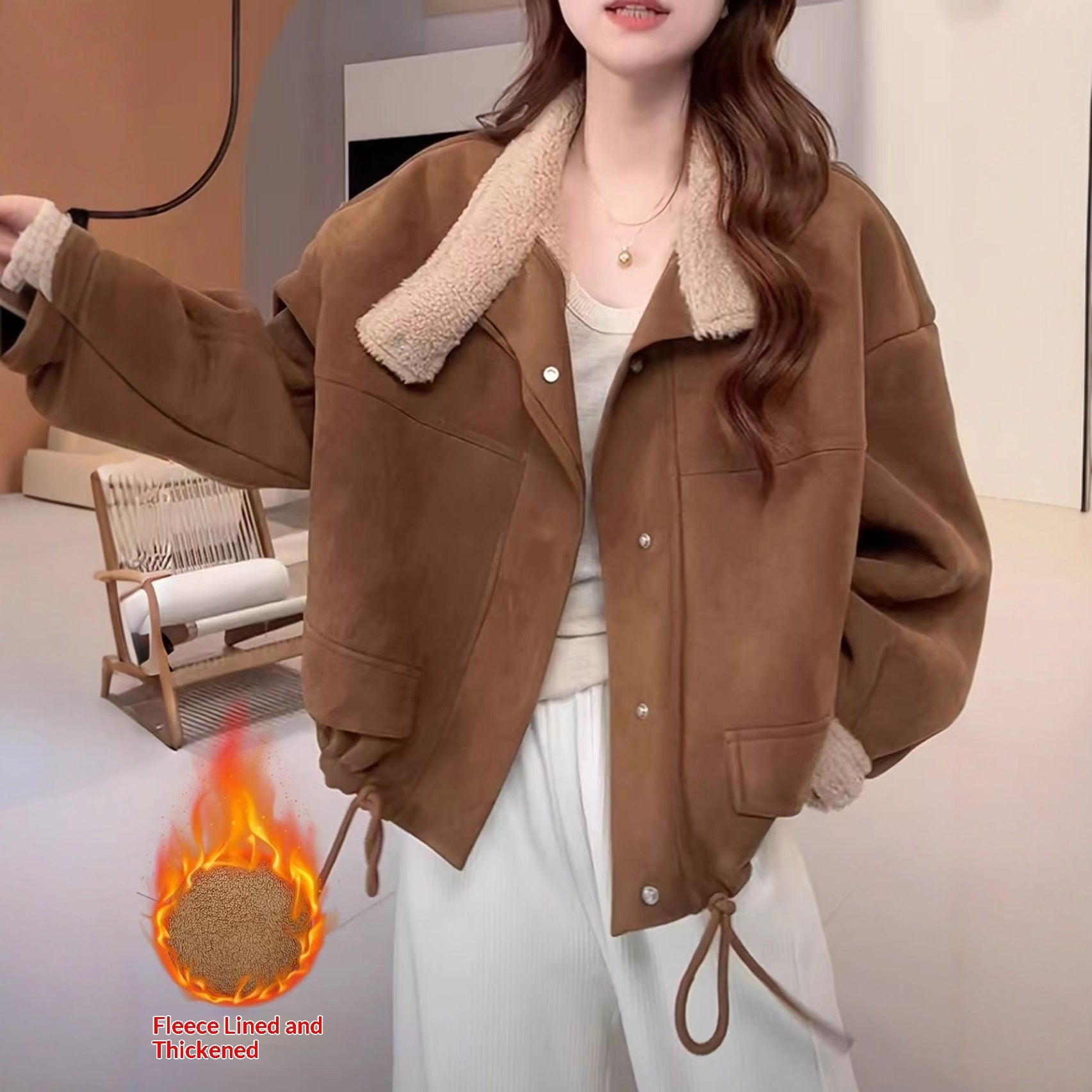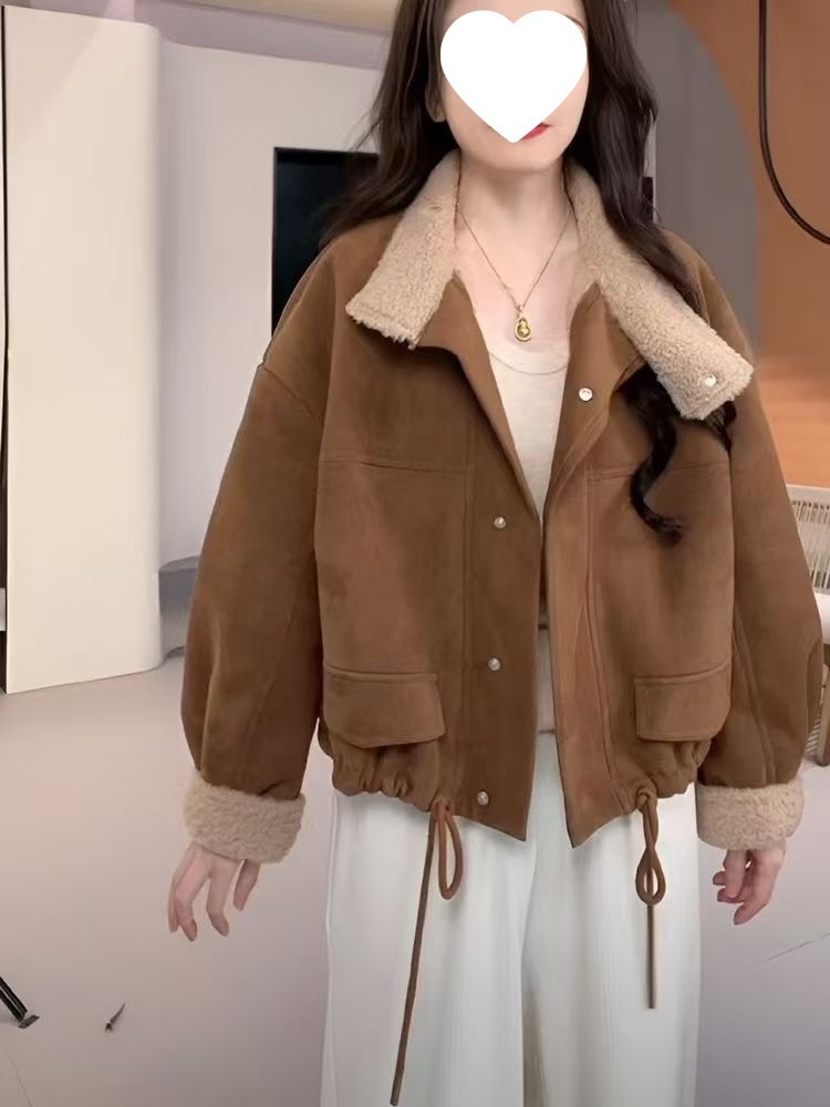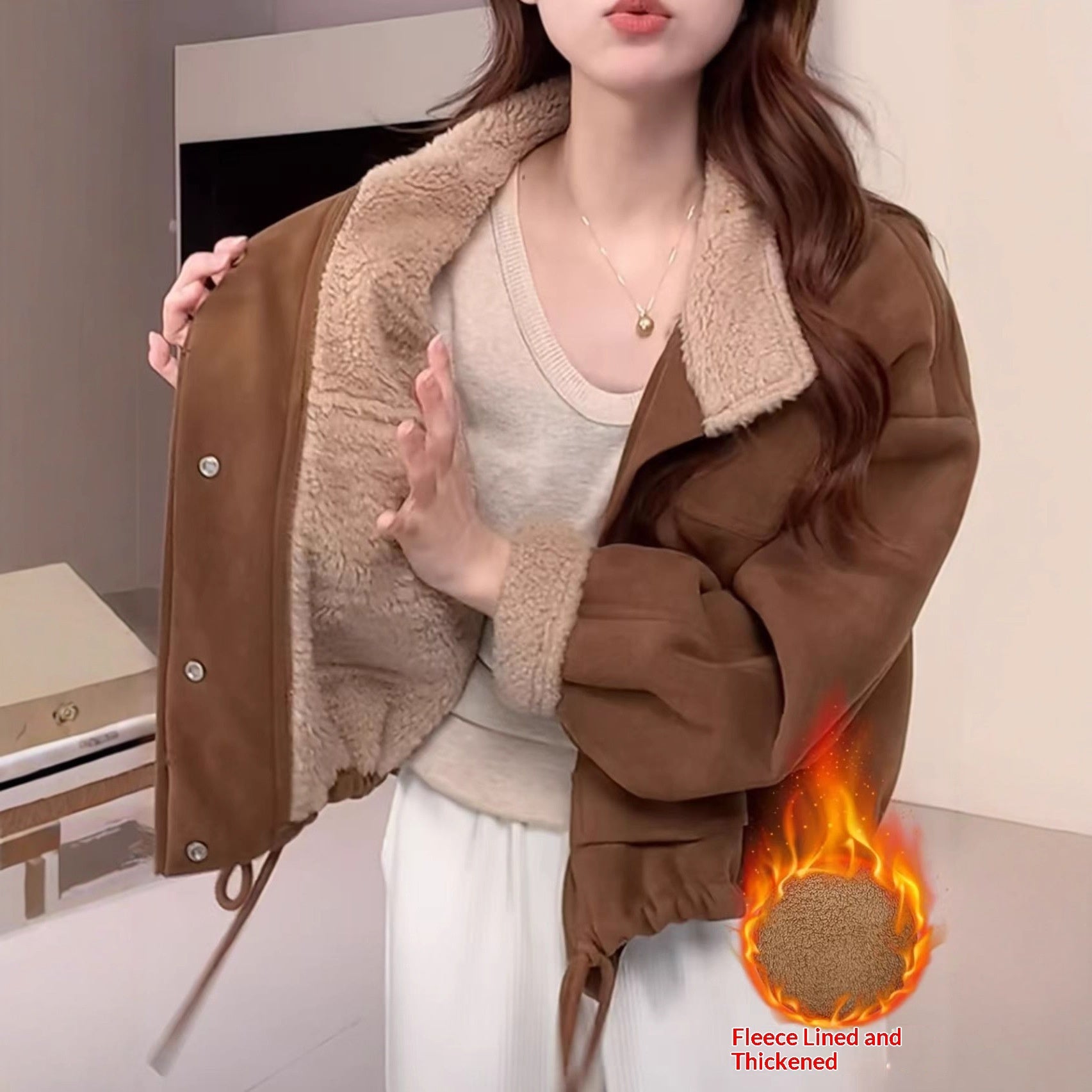 Jachetă scurtă din lână de miel pentru femei, căptușită, din piele întoarsă, maro, bumbac
