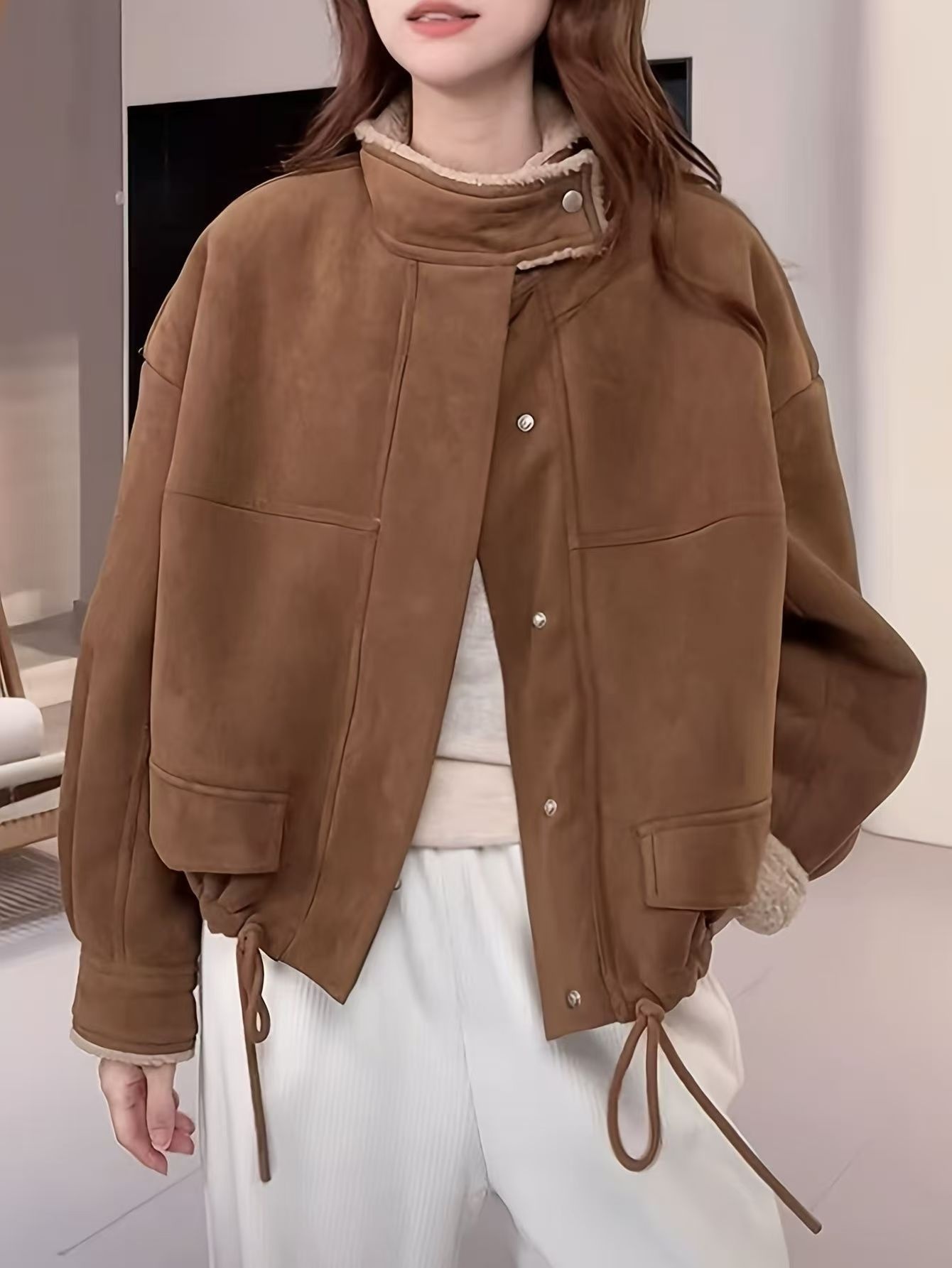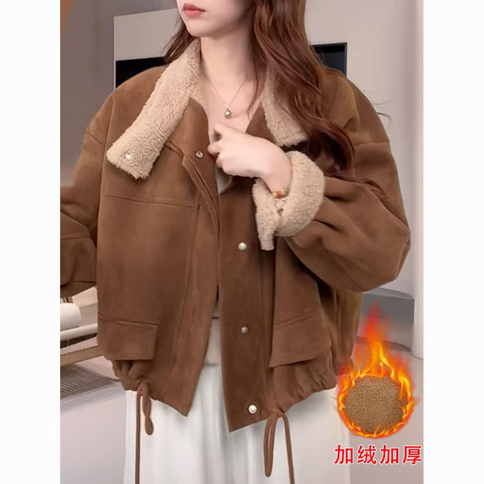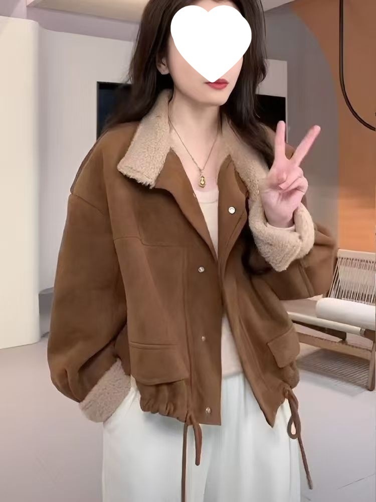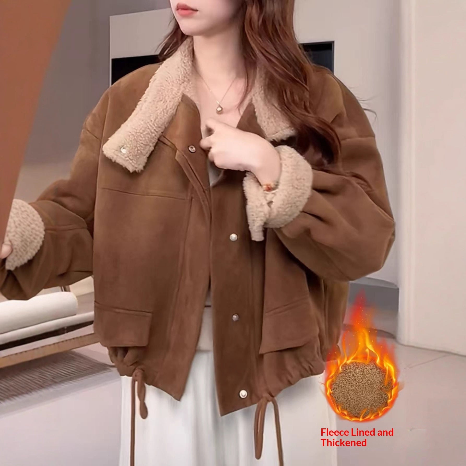 Jachetă scurtă din lână de miel pentru femei, căptușită, din piele întoarsă, maro, bumbac