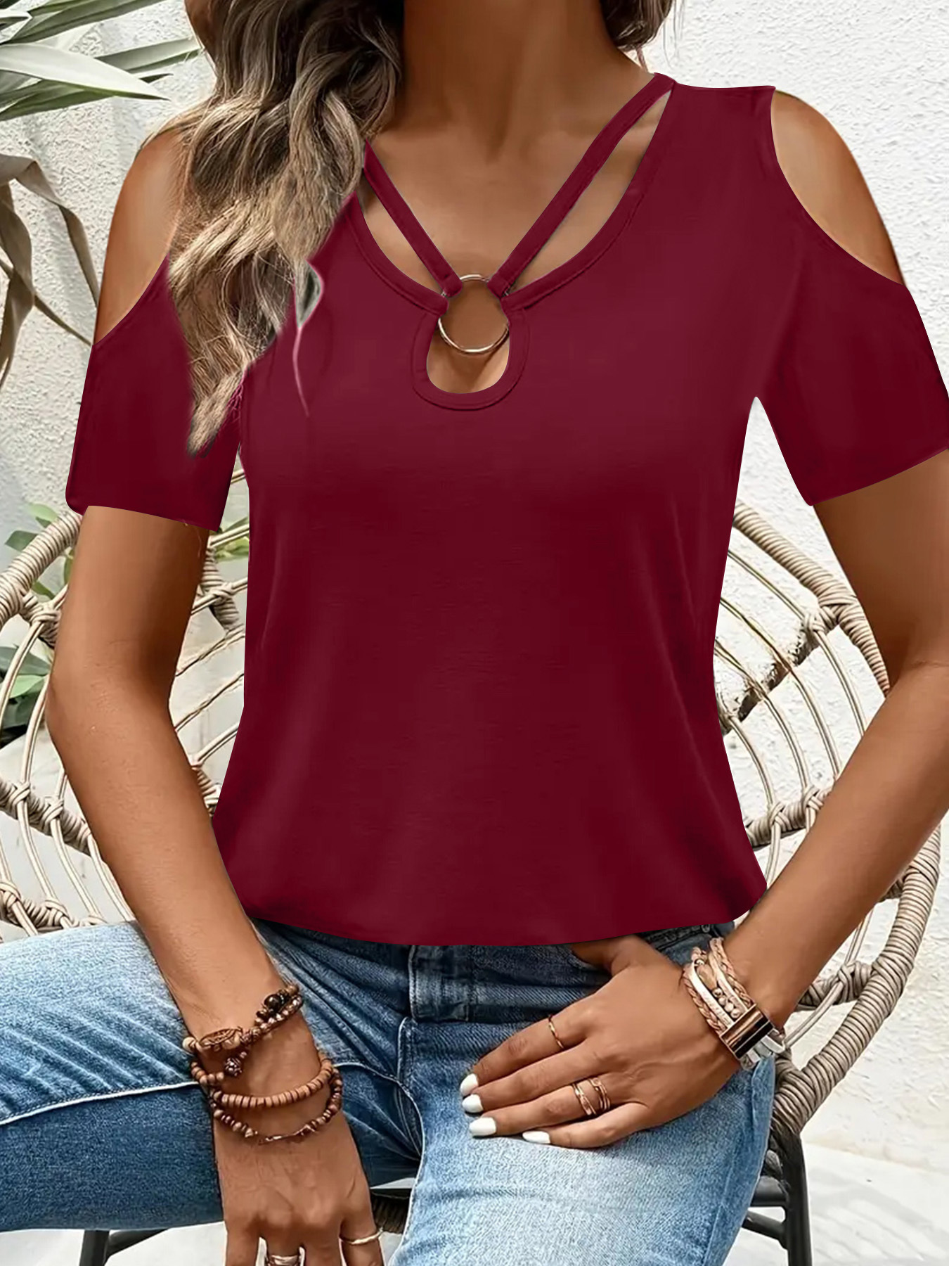Tricou damă cu mânecă scurtă, croială lejeră, cu decolteu în V, fără umeri